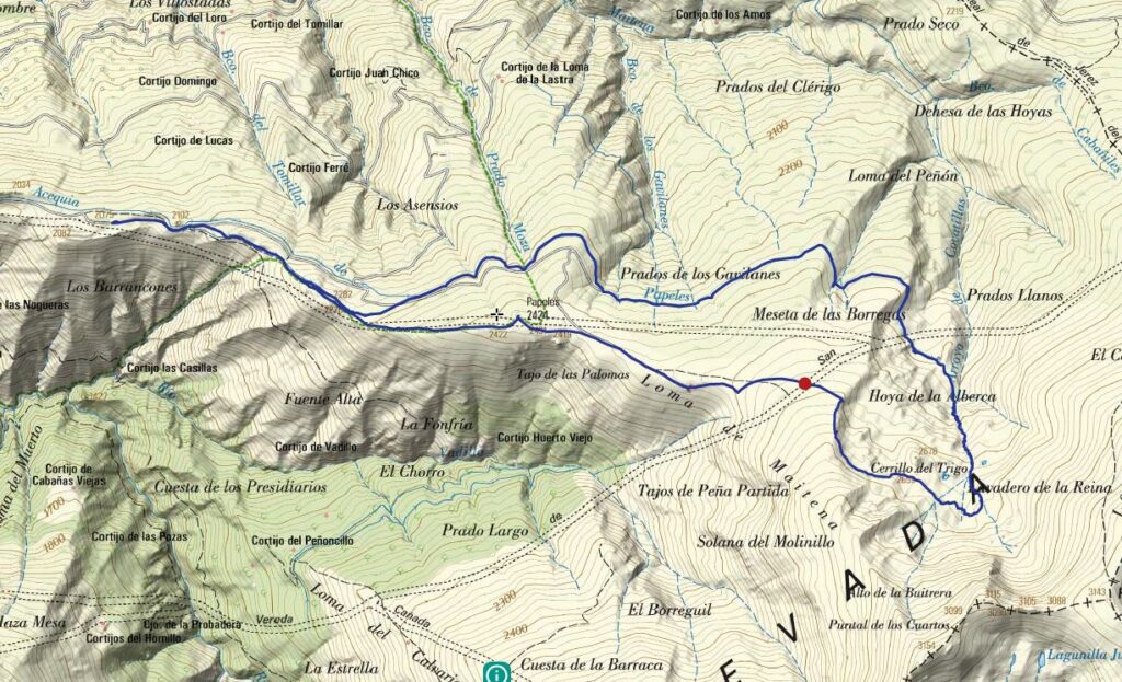 Se plantea la ruta de forma circular en sentido horario ascendiendo cómodamente por la Acequia de Papeles permitiéndonos afrontar los Lavaderos de la Reina por vía ascendente, que permite disfrutar plenamente y de forma frontal de las múltiples cascadas y túneles de nieve que caprichosamente va labrando el arroyo en el glaciar.