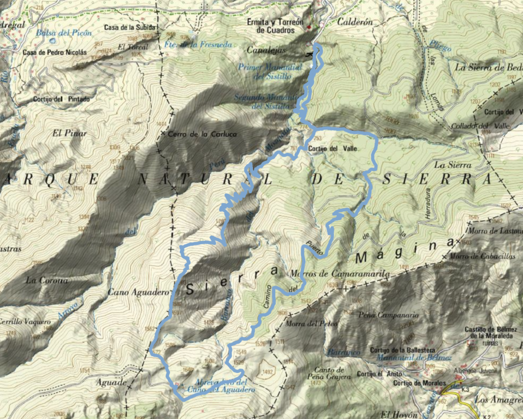 Partimos del área recreativa de Cuadros tomando la pista del Aguadero donde podremos disfrutar de los cortes del terreno para construir la pista que nos mostrarán interesantes efectos de los movimientos tectónicos que originan los pliegues geológicos que llegan a quedar totalmente en vertical. A unos 2 km nos desviamos de la pista hacia el carril a la derecha para llegar a las ruinas del Cortijo del Valle o del Chucho.