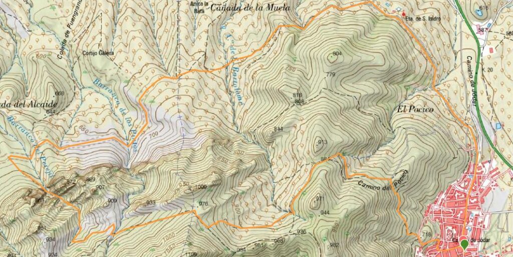 Pasado el cañón encontraremos una fuente de piedra, a 860 metros de altura, para dar de beber a los animales que pastan por la zona. Desde aquí solo queda un pequeño esfuerzo para conseguir los 980 metros de altitud, punto más alto del recorrido. Pasado este punto comenzará el descenso hasta el parque periurbano del pueblo. Una vez que lleguemos a Jodar, intentaremos visitar el castillo que está próximo al parque.