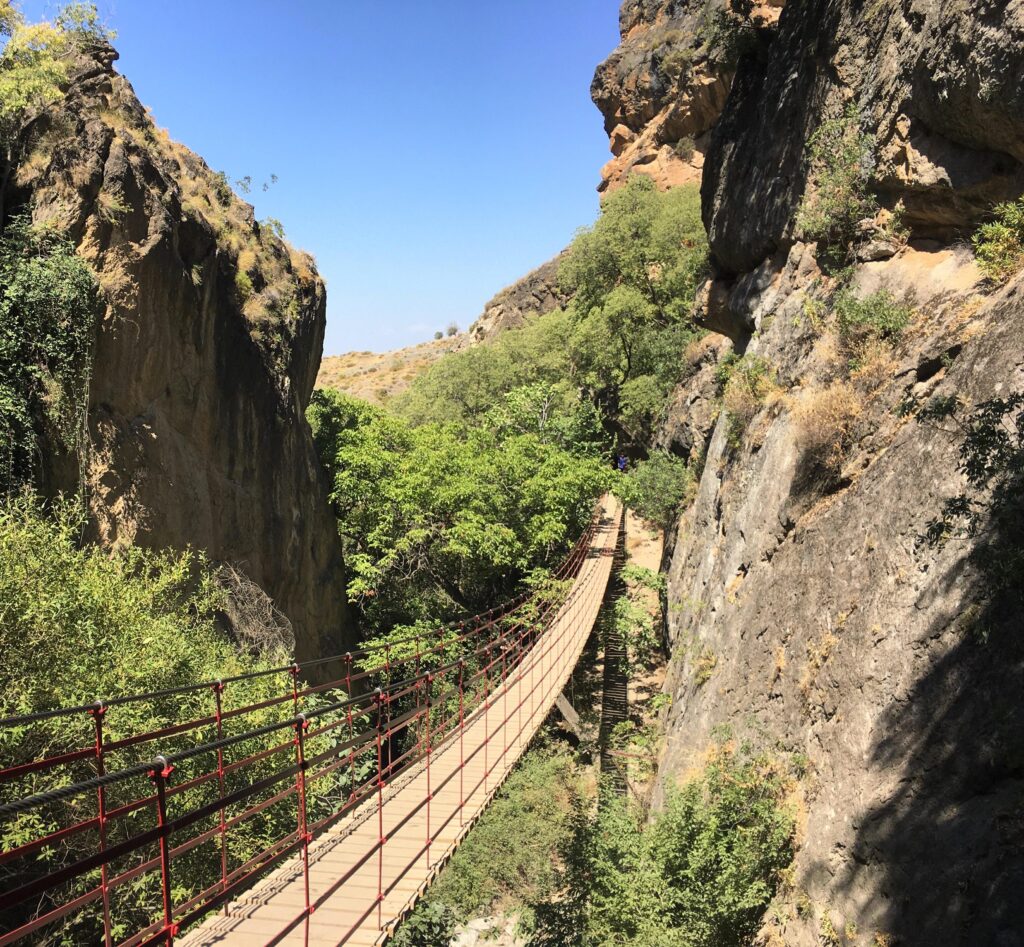 Al salir de la parte mas angosta del cañón, nos encontraremos con un puente colgante de 63 metros de largo, construido a principios del siglo XX. Éste cruza el río sobre una cascada, hoy de hormigón, que sirvió de presa para el canal de una central eléctrica. Continuamos nuestra ruta por un camino de escaleras y barandas muy bien marcado, en el que atravesaremos otros puentes de menor longitud. El camino es muy cómodo.