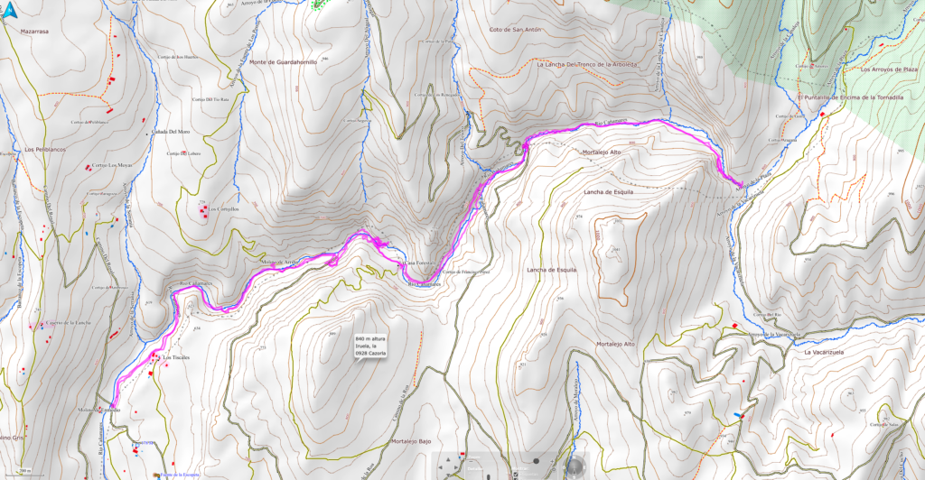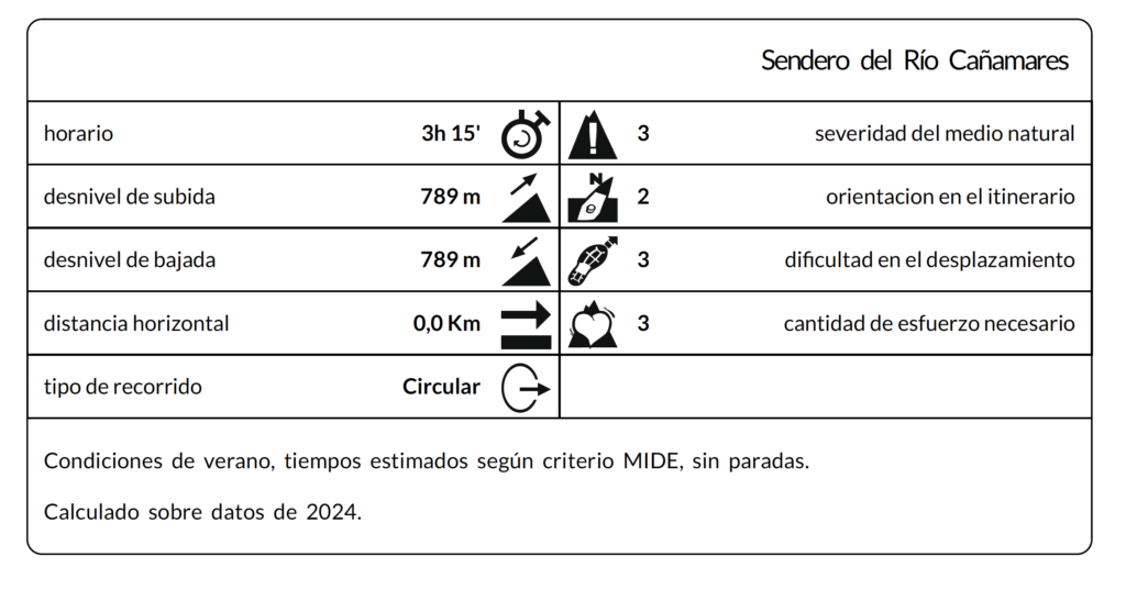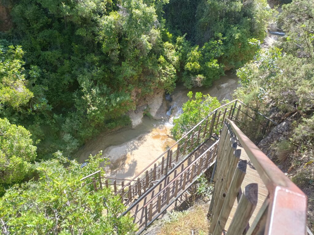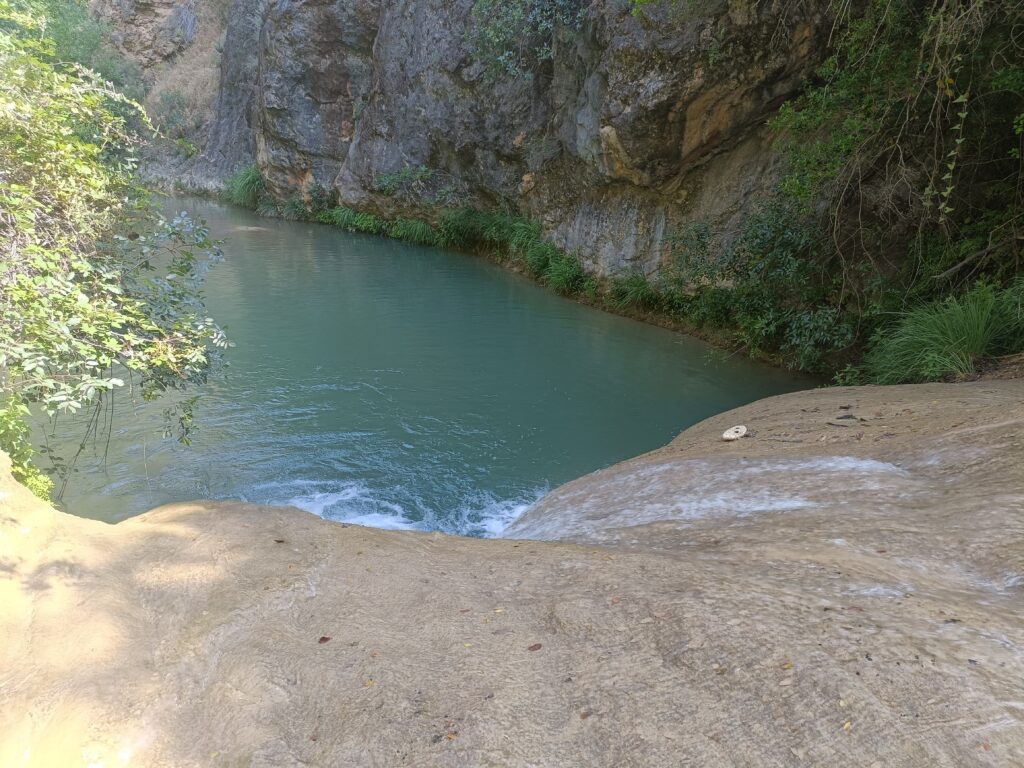 Se trata de un tramo bien señalizado, aunque ya algo deteriorado algunos puntos, pero que no presenta ninguna dificultad su seguimiento en la primera parte del recorrido. Se inicia la ruta al finalizar el Camino del Rosal (Molino de Enmedio), al que se puede acceder fácilmente desde la carretera y aparcar sin demasiada dificultad. Se inicia el recorrido inicialmente entre olivos hasta llegar al inicio del cañón por donde discurrirá la ruta. La mayor parte del trayecto iremos paralelos al río, por la margen izquierda, en zona totalmente cubierta de vegetación que nos cubrirá del sol y nos permitirá oír el agua y asomarnos a observar su cauce. Nos iremos encontrando con zonas donde el cañón se estrecha y es necesario separarnos de la orilla para poder superar el abrupto corte. No se trata de subidas largas, pero sí muy abruptas, como puede observarse en el perfil de la ruta. A unos 3,5 kms, nos encontramos con una zona donde podremos ver unas pozas espectaculares que dejaremos a la izquierda y tomaremos unas escaleras de madera que salvan un destacable nivel vertical. Hay que tener cuidado porque algunos peldaños de las maderas están algo suelto o estropeados. A la vuelta nos refrescaremos en estas pozas, pero ahora subiremos para disfrutar de unas vistas del cañóndesde lo alto de la escalinata.