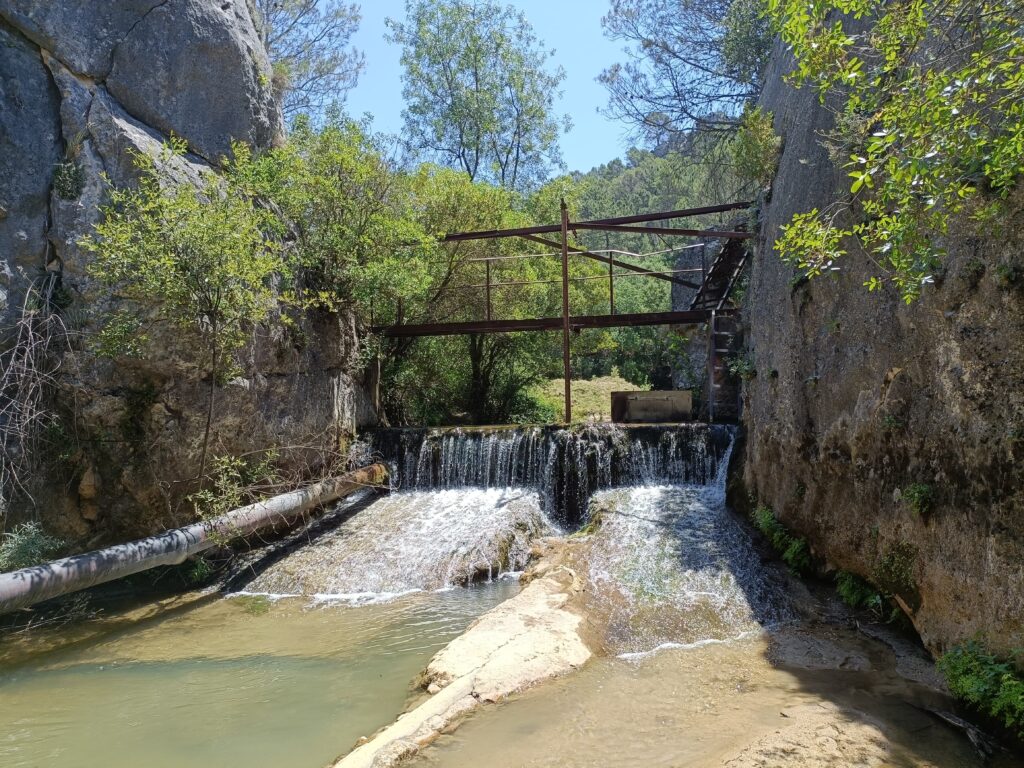 Continuamos el camino marcado, que en su tramo final cruzaremos por un puente que nos llevará por su margen derecha, hasta llegar a lo que se podría considerar como final de la parte primera de la ruta, la denominada Opción A. En esta zona, donde nos encontramos con unas pistas, hay una pequeña poza o represa donde podemos refrescarnos. Quienes opten por la Opción A podrán esperar en este punto, o volver a la zona de las pozas justo bajo las escaleras de metal.