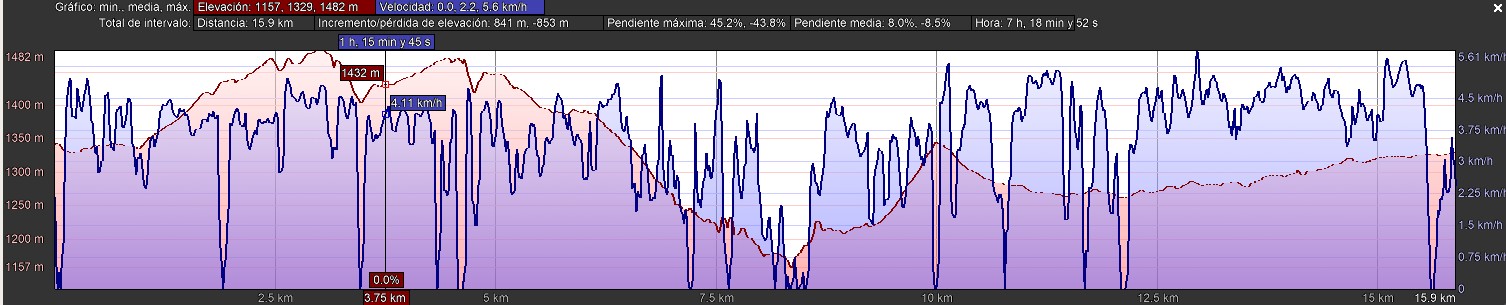 - Tramos de pista o camino forestal o rambla: 15 % (aprox.)